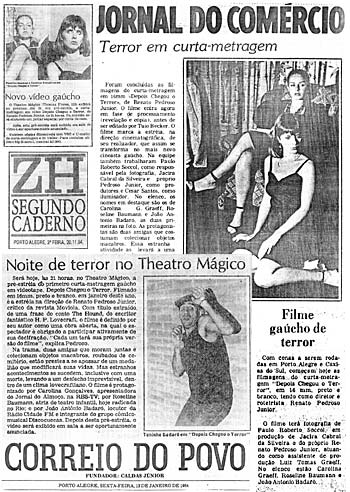 | "Depois Chegou o Terror é uma experiência curiosa em vários sentidos. Primeiro, porque é uma mescla de cine e vídeo. Foi rodado em 16mm, preto e branco, e transcrito para sua finalização e sonorização em vídeo. Depois, trata-se de um filme de horror, gênero pouco freqüente no cinema gaúcho e no cinema brasileiro. Fascinado pela obra do americano Howard Phillips Lovecraft, Nemo Nox tentou colocar em seu curta-metragem alguns dos medos e abismos da obra de Lovecraft, através da história de duas mulheres que colecionam peças raras roubadas de cemitérios. Carolina Gonçalves e Roseline Baumann são as duas atrizes do filme, que conta ainda no elenco com a presença de João Antonio Badaró. Realizado de forma independente, Depois Chegou o Terror é mais um título a ser considerado para a futura história do cinema gaúcho e as alternativas encontradas pelos cineastas locais para continuar contando histórias em imagens animadas." (Tuio Becker, Rádio Guaíba, Porto Alegre, 20 de novembro de 1984) | ![]() |