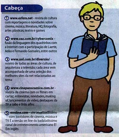 Matéria no jornal Folha de S. Paulo de 6 de setembro de 1999: "Guia selecionadíssimo para um feriadão feliz à frente da tela, com opções para dez diferentes tipos de internauta."