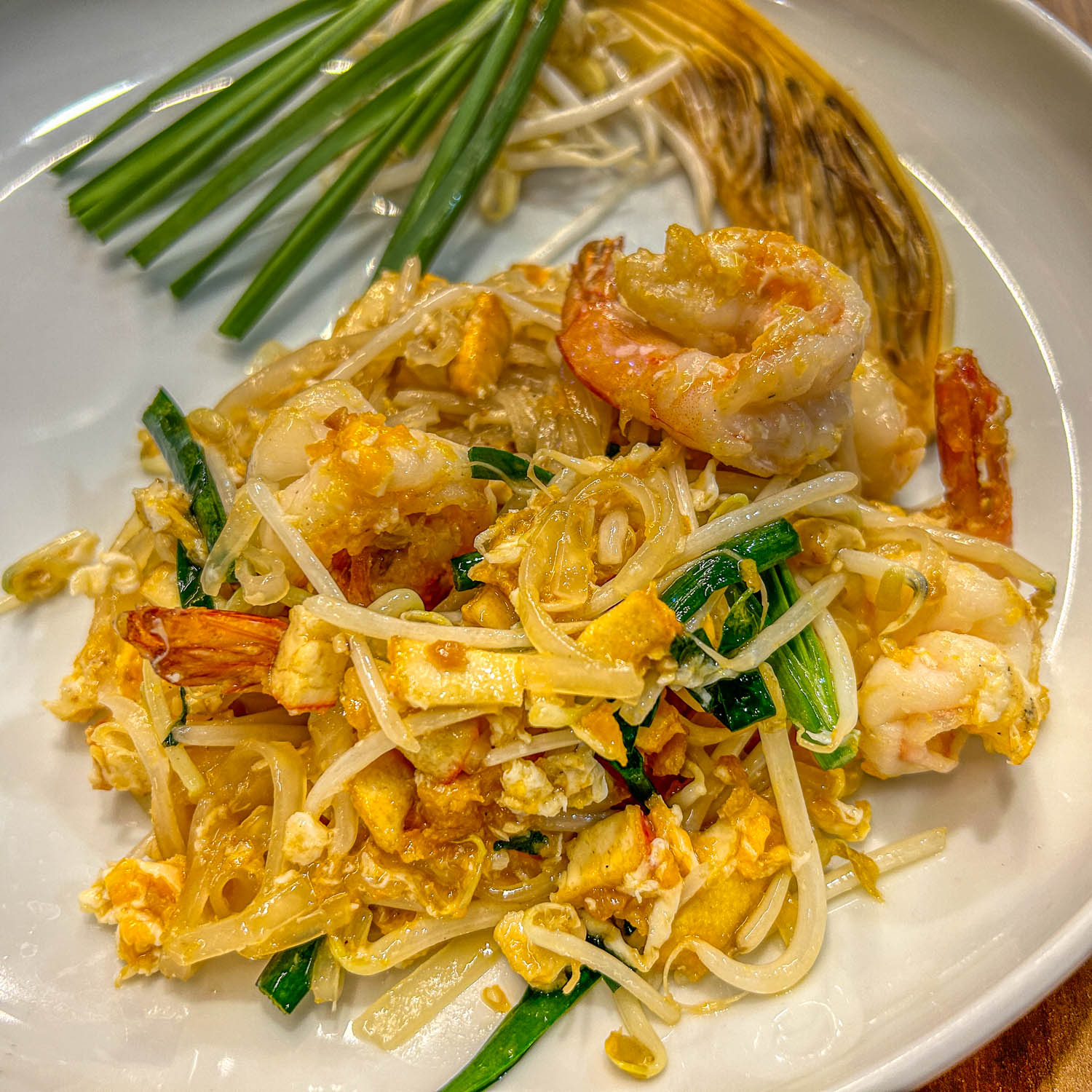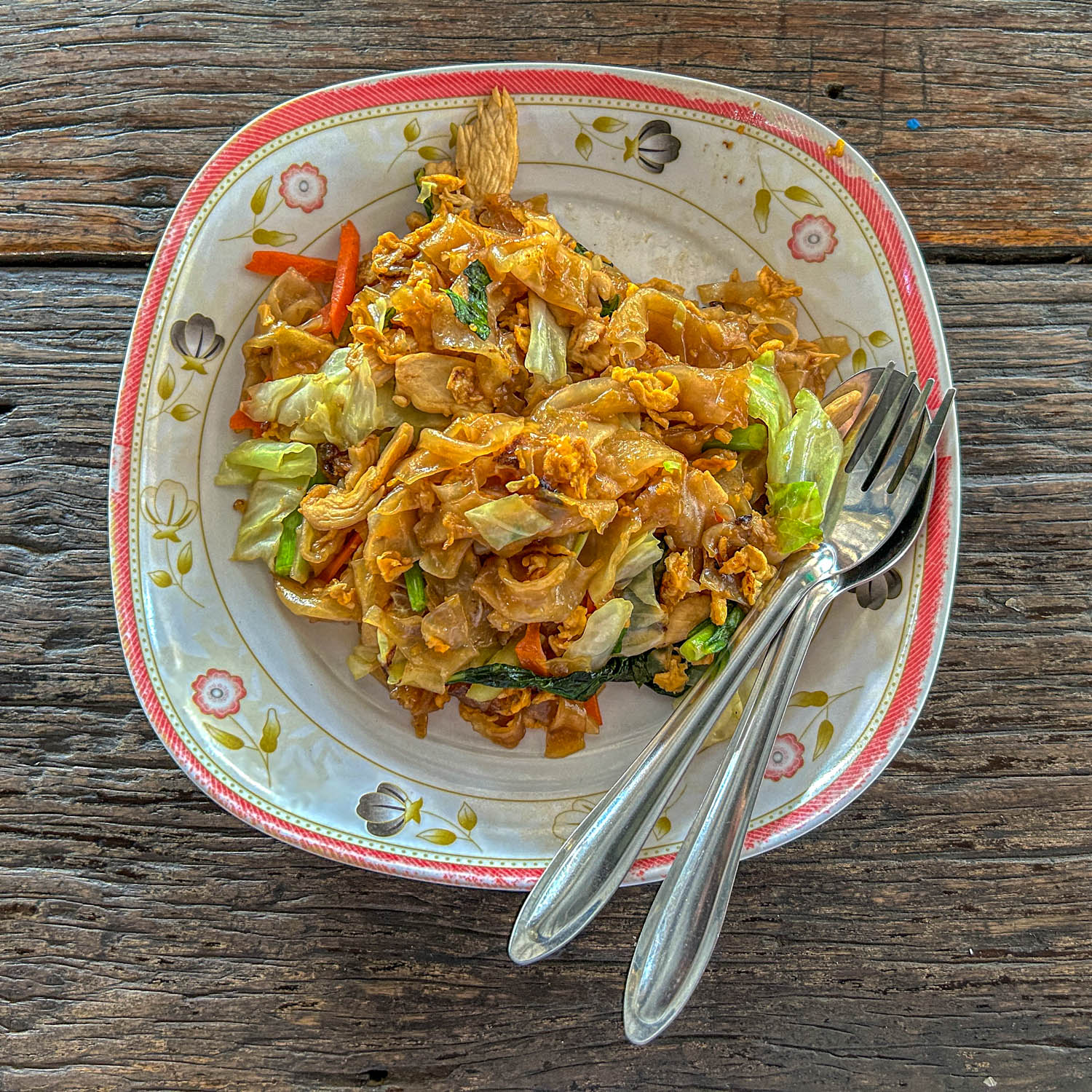 to eat in a non-spicy version were stir-fried rice noodles (pad thai or