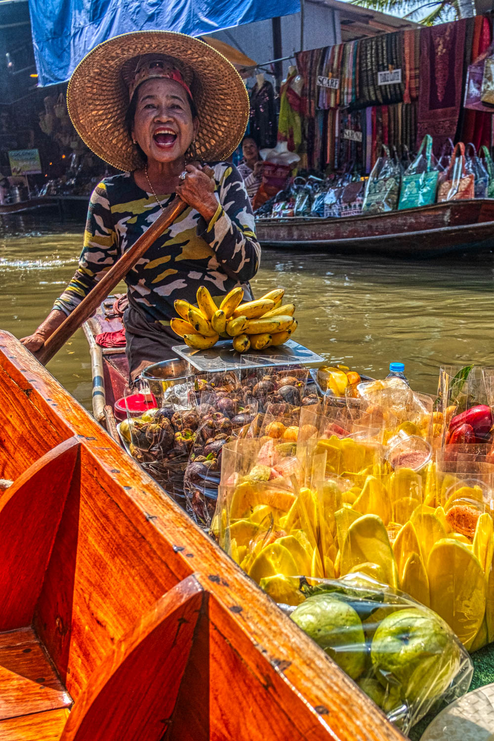 In Damnoen Saduak, there was a floating market. Buyers navigate the