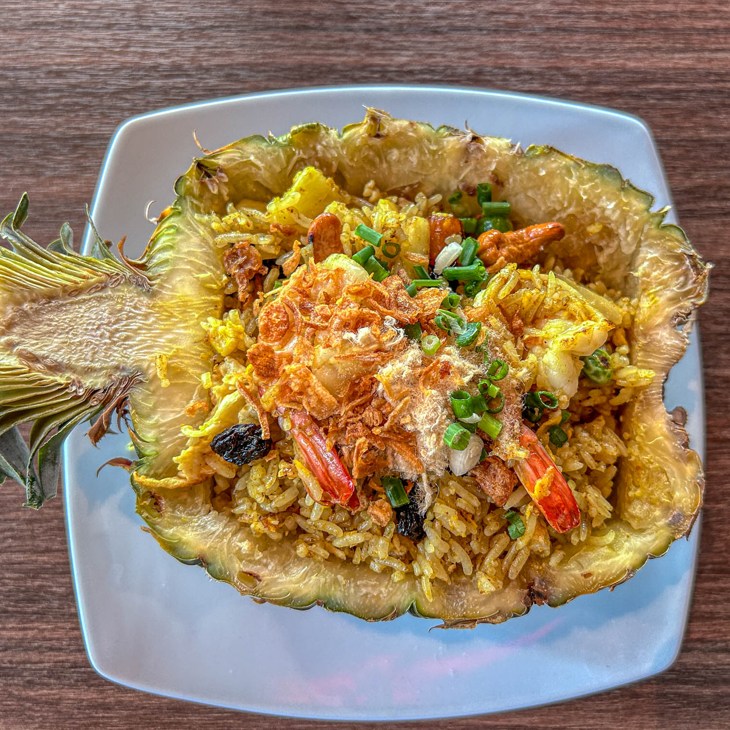 (khao pad), both usually served with chicken, pork, or shrimp. For